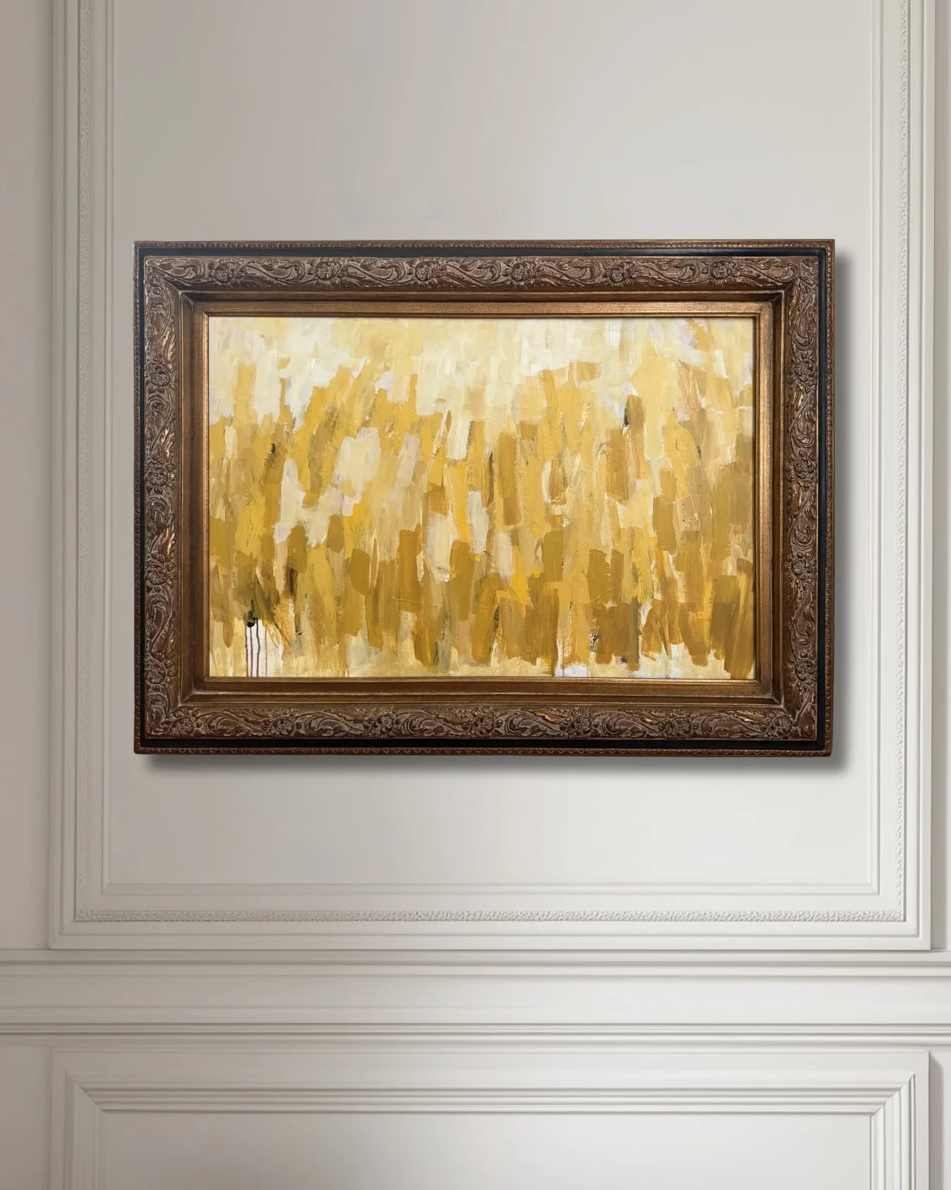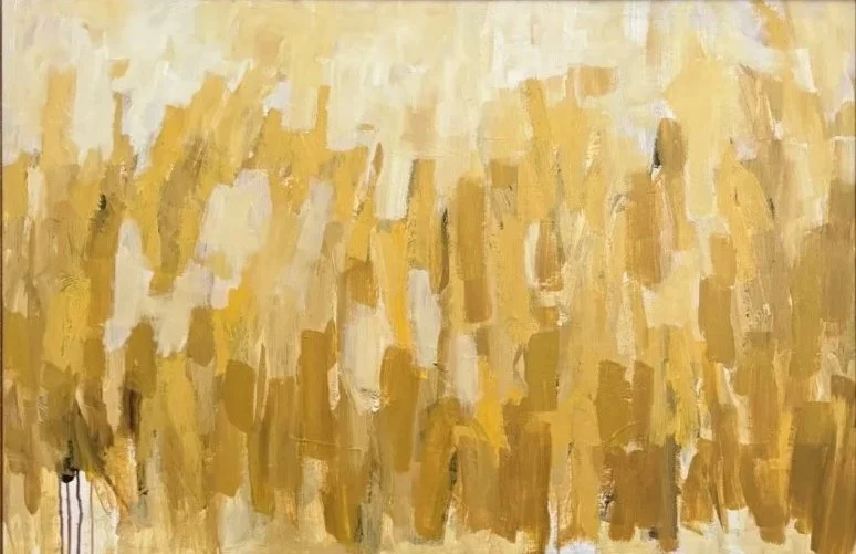 This original acrylic abstract artwork was painted on a 36 x 48 inch gallery wrapped canvas. It is a floral painting with a modern feel. With its warm yellows and browns, it is intended to bring an atmosphere of energy and warmth.